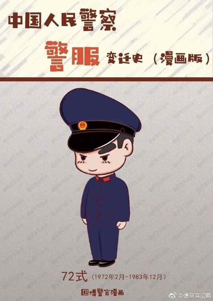 “七二式”警服冬夏装上下均为藏蓝色。恢复“五五式”警服大檐帽式样,保留软式解放帽,均为藏蓝色。帽徽为红漆底圆形,中心凸压国徽。